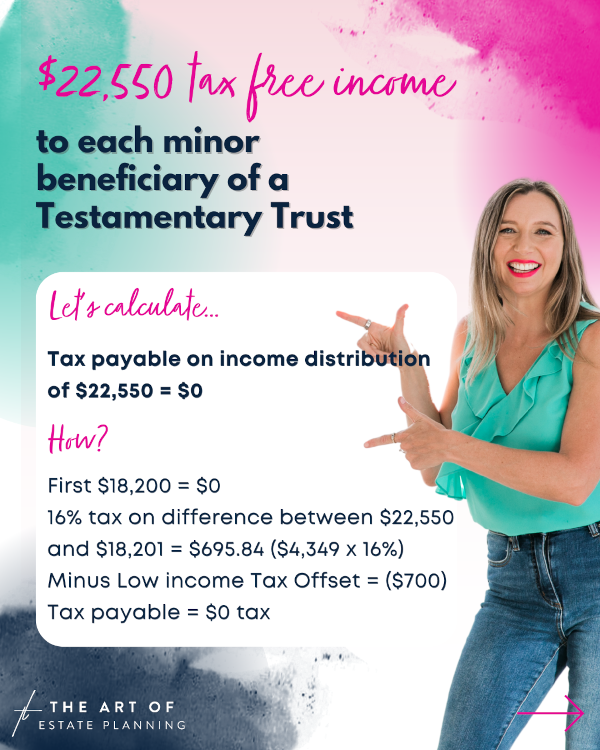 Testamentary discretionary trusts are the only structure in the Australian tax system that allows you to allocate tax-free amounts to children and tax children at adult marginal tax rates.
